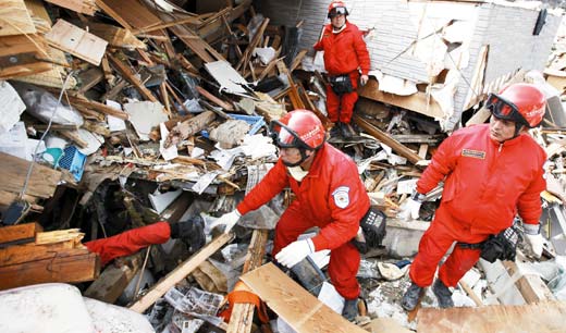 赴日的台灣救援隊十七日在岩手縣的大船渡市協助救災與尋找生還者。