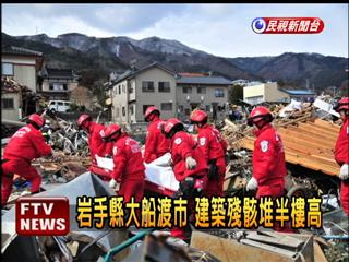 穿著紅色制服的中華民國搜救總隊,救援前往飽受海嘯蹂躪的岩手縣大船渡市,這個靠海村落在災後宛如廢墟,面目全非,所有建築通通躺平,殘骸堆了半層樓高,原本的住宅區裡甚至卡了一艘原本該停在港口的漁船,大自然的破壞威力可想而知。