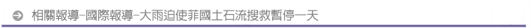 菲律賓土石流搜救工作進入第天,但今天大雨滂沱,迫使搜救工作暫停一天。