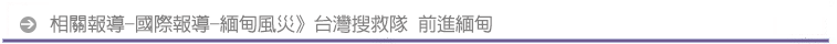 中華民國搜救總隊與靈鷲山佛教慈善基金會,昨天派出37位國際搜救隊員與8位基金會員攜帶8公噸的賑災物資與醫療藥品,搭乘華信航空前往仰光援助。 中華民國搜救總隊說,先把緬甸仰光機場作為聯絡中心,靈鷲山緬甸禪修中心做為賑災救濟物資發放基地。 搜救總隊同時獲得華信航空提供首批緊急救援小組機位及物資運輸貨艙,才能順利前往仰光援助,而長期在緬甸協助孤雛教養、建構社區基本醫療系統的靈鷲山佛教教團聞訊立即啟動救難機制,率先捐出20萬美金。