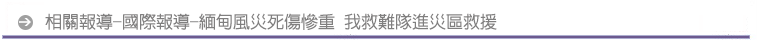 熱帶氣旋重創緬甸,風災進入第六天,軍政府行動緩慢,上百萬災民在飢餓和疾病中掙扎。由於國情特殊,軍政府拒絕部份外援,目前只有聯合國救災專家入境以及空投物資。不過,我國宗教團體在緬甸長期耕耘,援助偏遠地區居民,因此,中華民國搜救總隊成了第一支獲得許可入境的救難隊伍。